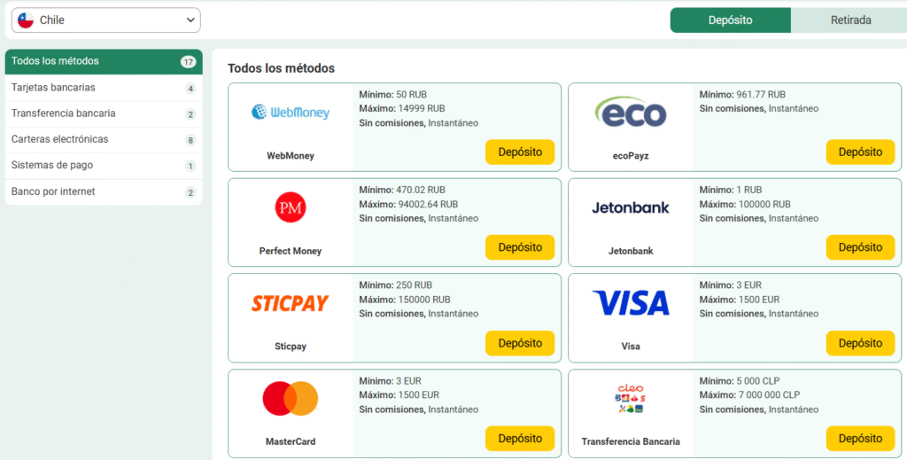 BetWinner Chile mejoró mucho su oferta para responder a las condiciones del mercado local. De este modo, se ha adaptado al carácter local de los jugadores, permitiendo pagos en pesos chilenos y ofreciendo atención al cliente en español. Y por otro lado, ofrece operaciones mediante métodos de pago ampliamente utilizados en la región. Esto permite conseguir un gran número de usuarios en Chile.